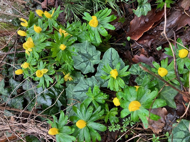 Additional light in autumn and winter from renovating some hedges seems to have encouraged the winter acconites to spread, but also some cyclamen. There is one that has wonderful silvery leaves which helps it standout from the ivy and comfrey that surround it, and beneath a crab apple tree are the first leaves of forget-me-not.