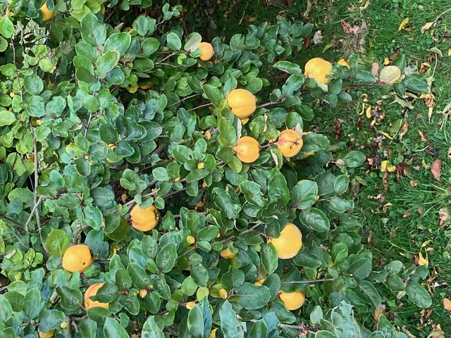 The wallflowers, winter jasmine and a calycanthus Aphrodite are still in bloom and the quince tree is dripping with its apple/pear like fruit.